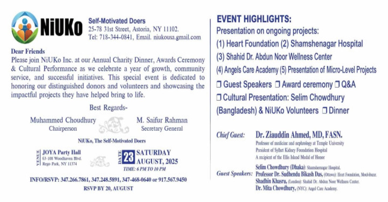 আগামী শনিবার, ২৩ আগস্ট নিউইয়র্কের রিগো পার্কের জয়া পার্টি হলে অনুষ্ঠিত হতে যাচ্ছে প্রবাসী সমাজসেবী সংগঠন নি-ইউ-কো ইনক. (NiUKo – Self-Motivated Doers) এর বার্ষিক চ্যারিটি ডিনার, অ্যাওয়ার্ডস সেরিমনি ও সাংস্কৃতিক অনুষ্ঠান। বিকেল ৬টা থেকে রাত ১০টা পর্যন্ত চলবে এই মহতি আয়োজন। অনুষ্ঠানে উপস্থাপিত হবে সংগঠনের বেশ কয়েকটি চলমান প্রকল্প। এরমধ্যে রয়েছে, হার্ট ফাউন্ডেশন, (মৌলভীবাজার), শমশেরনগর হাসপাতাল, শহীদ ড. আব্দুন নূর ওয়েলনেস সেন্টার, এঞ্জেলস কেয়ার একাডেমি, নিউইয়র্ক এবং আরও কিছু মাইক্রো-লেভেল উদ্যোগ।