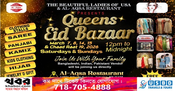 নিউইয়র্কের কুইন্সের জ্যামাইকায় অনলাইনভিত্তিক গ্রুপ দ্য বিউটিফুল লেডিস অফ ইউএসএ ও আল-আকসা পার্টি হলের যৌথ উদ্দ্যোগে অনুষ্ঠিত হবে যাচ্ছে “কুইন্স ঈদ বাজার -২০২৬”। আসন্ন পবিত্র ঈদুল ফিতর উপলক্ষে নিউইয়র্কের অন্যতম বৃহৎ ও জনপ্রিয় মেলা “কুইন্স ঈদ বাজার” অনুষ্ঠিত হবে মার্চ মাসের ৭, ৮, ১৪, ১৫ এবং পবিত্র চাঁদ রাতে (১৯ মার্চ)। কুইন্সের জ্যামাইকার প্রাণকেন্দ্রে অবস্থিত আল-আকসা পার্টি হল (১৪৮-০১ হিলসাইড এভিনিউ,জ্যামাইকা, নিউইর্য়ক ১১৪৩৫) প্রাঙ্গণে সাপ্তাহিক শনিবার ও রবিবার ব্যাপী এ আয়োজন দুপুর ১২টা থেকে মধ্যরাত পর্যন্ত চলবে।