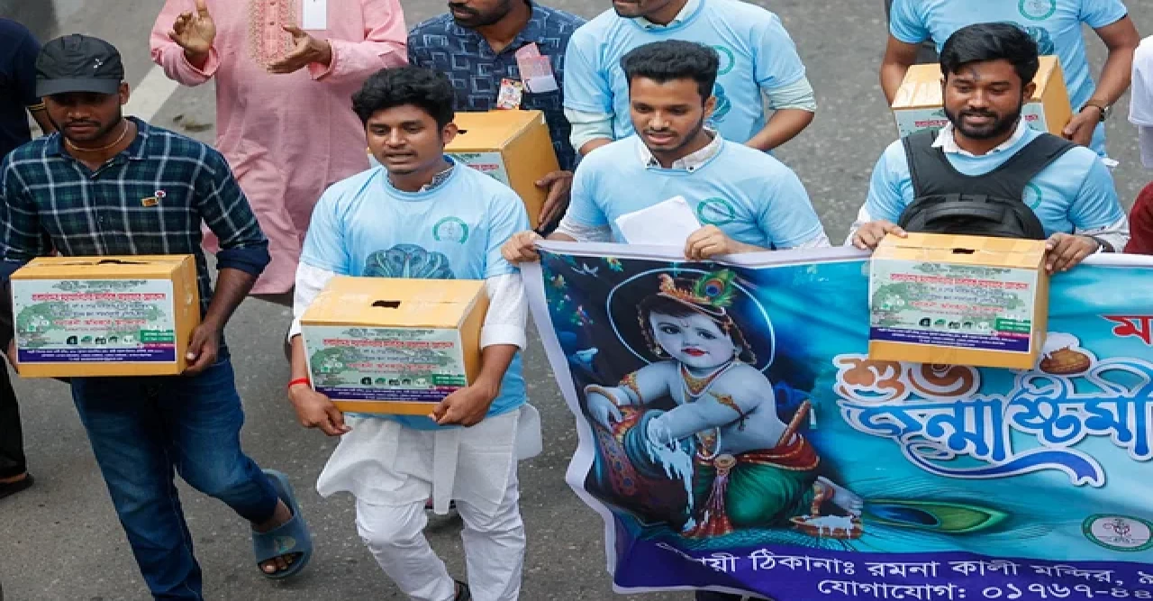 তিনি বলেন, ধর্ম ব্যবসায়ী ও ধর্ম নিয়ে রাজনীতি করা ব্যক্তিদের পরাজিত করে দেশকে সমৃদ্ধির দিকে নিয়ে যেতে হবে। তিনি হিন্দুদের সংখ্যালঘু না ভাবার অনুরোধ জানান। হিন্দুদের কোনো দলের রাজনৈতিক খুঁটি হিসেবে ব্যবহৃত না হওয়ারও অনুরোধ জানান তিনি। জন্মাষ্টমীর মিছিলের উদ্বোধন করেন তথ্য উপদেষ্টা মো. নাহিদ ইসলাম। তিনি বলেন, ‘দেশের যেকোনো জনগোষ্ঠী, সংখ্যালঘু জনগোষ্ঠী যদি অনিরাপদ থাকে, তাহলে গোটা বাংলাদেশ অনিরাপদ থাকে। আমরা মনে করি, ধর্মীয় জনগোষ্ঠীর নিরাপত্তা দেওয়ার দায়িত্ব রাষ্ট্র, সরকার ও সকল জনগণের। বাংলাদেশকে এক থাকতে হবে, ঐক্যবদ্ধ থাকতে হবে। আমরা ঐক্যবদ্ধ থাকলে বাইরের কেউ ষড়যন্ত্র করতে পারবে না।’ বিকেল চারটার দিকে জন্মাষ্টমী মিছিল পলাশী থেকে বাহাদুরশাহ পার্কের উদ্দেশে রওনা হয়। বিকেল চারটার দিকে জন্মাষ্টমী মিছিল পলাশী থেকে বাহাদুরশাহ পার্কের উদ্দেশে রওনা হয়।ছবি: তানভীর আহাম্মেদ গত ৫৩ বছরে সংখ্যালঘুদের ওপর হামলা হয়েছে; কিন্তু সেগুলোর বিচার হয়নি উল্লেখ করে নাহিদ ইসলাম বলেন, কারণ যারা বিচার করবে, তারা এ ধরনের ঘটনার সঙ্গে জড়িত ছিল।
