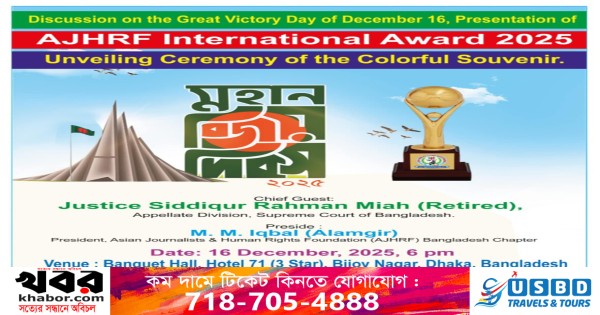 মহান বিজয় দিবস উপলক্ষে আগামী ১৬ ডিসেম্বর সন্ধ্যা ৬টায় রাজধানীর হোটেল ৭১-এ অনুষ্ঠিত হতে যাচ্ছে এশিয়ান জার্নালিস্ট অ্যান্ড হিউম্যান রাইটস ফাউন্ডেশন (AJHRF) আয়োজিত আন্তর্জাতিক পুরস্কার বিতরণী অনুষ্ঠান ও আলোচনা সভা। অনুষ্ঠানে থাকবে বিজয় দিবস আলোচনা সভা, “AJHRF International Award - 2025” প্রদান এবং একটি বর্ণাঢ্য স্মারক গ্রন্থের উদ্বোধন। দেশি-বিদেশি বিশিষ্ট ব্যক্তিত্বরা অংশ নেবেন ও মুক্তিযুদ্ধের চেতনা এবং মানবাধিকার ইস্যুতে মতামত রাখবেন।