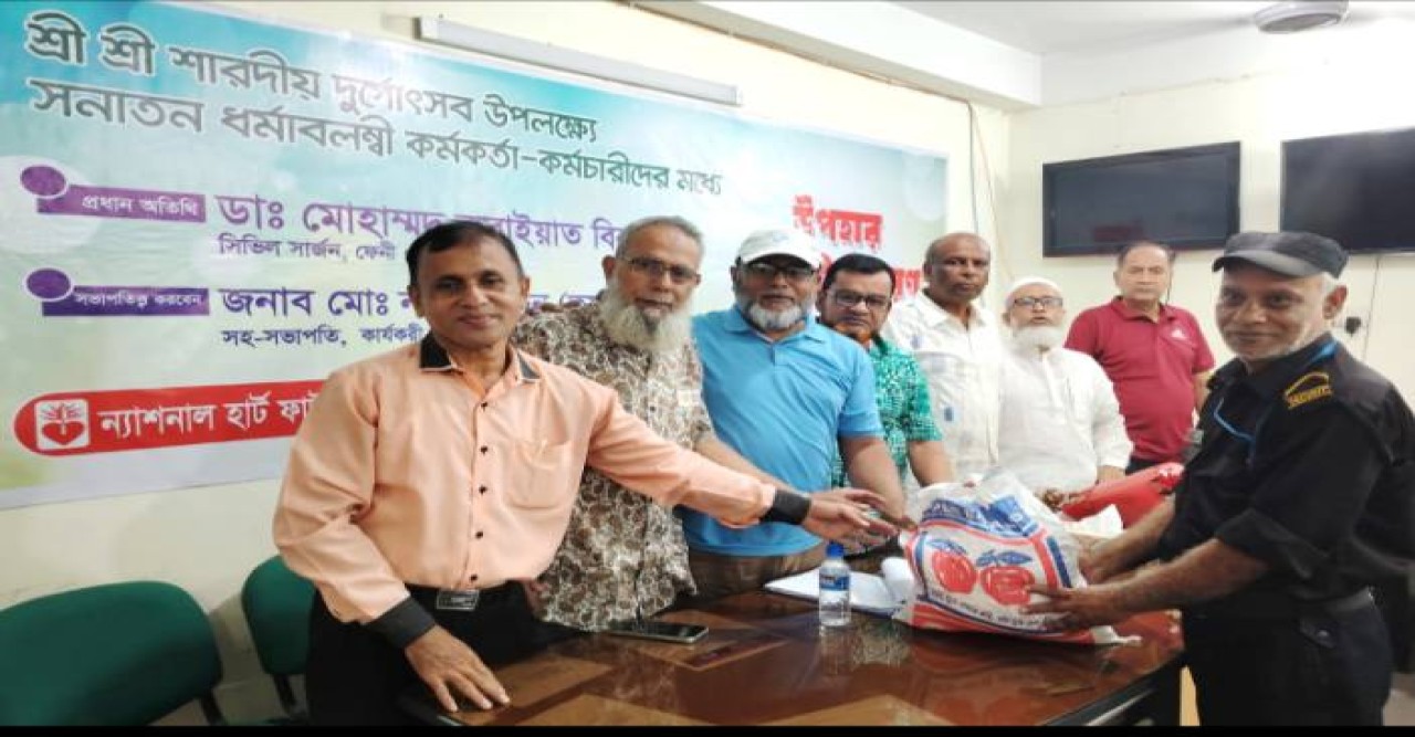 সনাতন হিন্দু ধর্মালম্বী কর্মকর্তা কর্মচারীদের মাঝে ফেনী ন্যাশনাল হার্ট ফাউন্ডেশনের উপহার সামগ্রী বিতরন