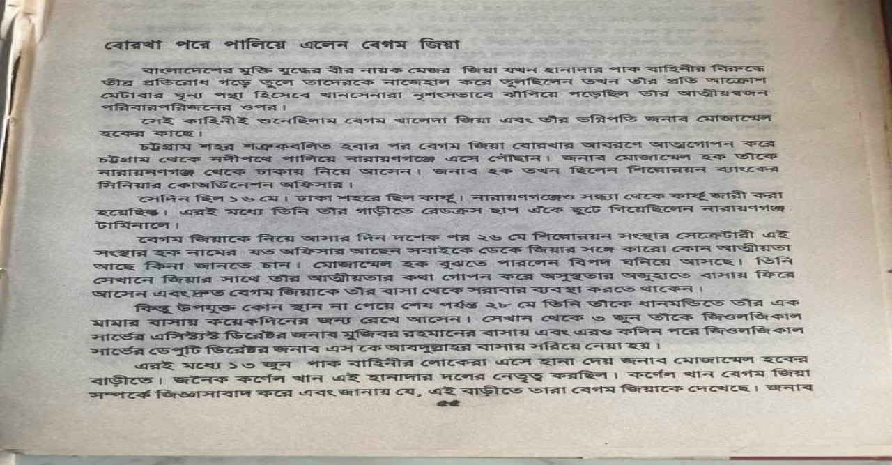 আজ বেগম জিয়ার মৃত্যুর পর সেই আশির দশকে আগামী প্রকাশনীর প্রকাশ করা আমার ‘একাত্তর কথা বলে’ বই থেকে বেগম জিয়ার সাক্ষাৎকারটি বের করলাম। নতুন করে পড়লাম। নতুন করে শিহরিত হলাম। মনে হলো এ কাহিনী সবার জানা উচিত। অনেক অপপ্রচার, অনেক কুৎসা বেগম জিয়া সম্পর্কে রটানো হয়েছে। সে সব অপপ্রচারের জবাব এই লেখাটি। পাকিস্তানি সেনাবাহিনীর বিরুদ্ধে বিদ্রোহ ঘোষণা করে তাদের বিরুদ্ধে সম্মুখ যুদ্ধ ঝাঁপিয়ে পড়া জিয়াউর রহমান যখন কালুরঘাট ব্রিজ পার হয়ে ওপারে আস্তানা গেঁডেছেন তখন শত্রু কবলিত চট্টগ্রাম থেকে বেগম জিয়া বোরখা পরে গোপনে নৌপথে পালিয়ে এসেছিলেন নারায়ণগন্জে। আসার আগে তিনি যোগাযোগ করেছিলেন তার ভগ্নিপতি মোজাম্মেল হকের সাথে। মোজাম্মেল হক তখন ছিলেন শিল্পোন্নয়ন ব্যাংকের সিনিয়ার কোঅর্ডিনেশন অফিসার।