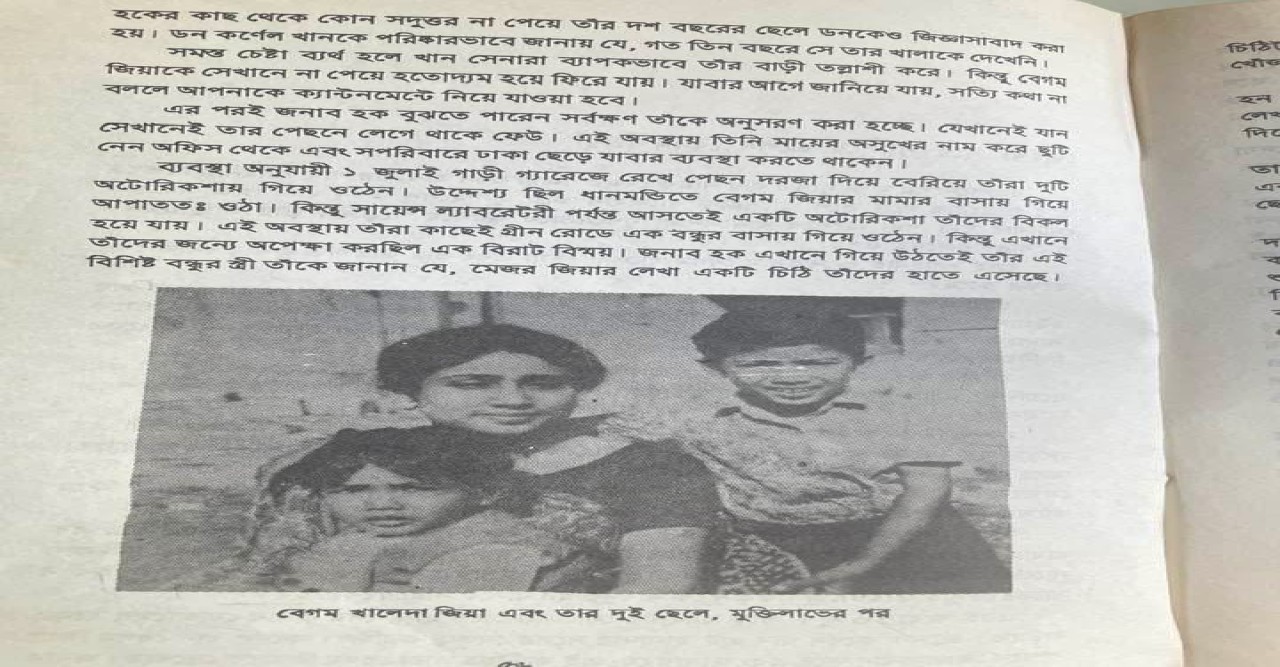 বেগম জিয়া সিদ্ধশ্বরী আসার আগে তার বাসাতেও ক’দিন ছিলেন। ৫ জুলাই মোজাম্মেল হকও ধরা পড়েন। ক্যান্টনমেন্টে যে নির্মম নির্যাতনের শিকার তারা হয়েছিলেন সেই কাহিনীই আমি সেদিন মোজাম্মেল হকের কাছে শুনেছিলাম। দৈনিক বাংলায় দুজনেরই সাক্ষাৎকার পেছনের পাতায় বড় করে পাশাপাশি ছাপা হয়েছিল। এ সাক্ষাৎকার আজ বিস্মৃতির অতলে। বেগম জিয়াকে সশ্রদ্ধচিত্তে স্মরণ করতে গিয়ে সেদিনের স্মৃতিতেই আমি ভারাক্রান্ত হলাম। এখানে তুলে ধরলাম সেই সাক্ষাৎকার থেকে কিছু কথা। আর দিলাম দুই শিশু সন্তানকে নিয়ে তোলা বেগম জিয়ার সেদিনের ছবিটা।