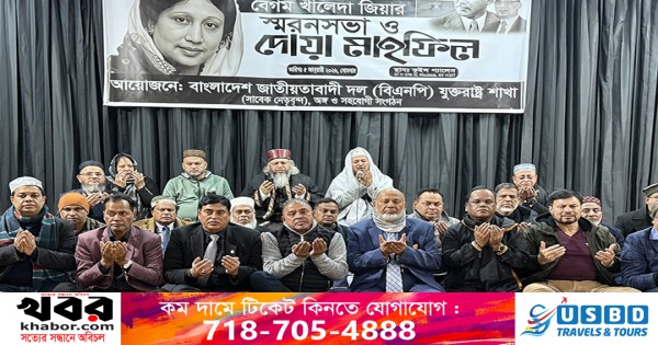 ৯১-এর নির্বাচনে বিজয়ী হয়ে বাংলাদেশে প্রথম নারী প্রধানমন্ত্রী নির্বাচিত হওয়ার বেগম জিয়া নিউইয়র্ক সফরকালে তার কাছে নিউইয়র্কে সোনালী এক্সচেঞ্জ প্রতিষ্ঠার জন্য অনুরোধ করেছিলাম। ম্যাডাম সে অনুরোধে সাড়া দিয়ে তৎকালীন অর্থমন্ত্রী এম. সাইফুর রহমানকে নির্দেশ দিয়েছিলেন এবং ১৯৯৪ সালে আমাদের সেই দাবী পূরণ হয়। শুধু তাই নয়, প্রবাসীদের প্রত্যাশা ‘ঢাকা-নিউইয়র্ক রুটে বিমানের ফ্লাইটও চালু হয়েছিল আমাদের পরম শ্রদ্ধেয় নেত্রী খালেদা জিয়ার প্রথম আমলেই। অর্থাৎ বেগম জিয়া শুধু আপসহীন নেত্রীই ছিলেন না, ছিলেন প্রবাসীবান্ধব নেত্রী। তার মৃত্যুতে দল, দেশ, জাতির অপূরণীয় ক্ষতি হলো। সভাপতির বক্তব্যে মোহাম্মদ গিয়াস উদ্দিন মরহুমা বেগম খালেদা জিয়ার প্রতি গভীর শ্রদ্ধা জানিয়ে বলেন, আমাদের প্রিয় নেত্রী মৃতুর পর যে সম্মান পেয়েছেন তার ইতিহাস হয়ে থাকবে। তাঁর ত্যাগ দেশ-জাতি মূল্যায়ন করেছে। তিনি তাঁর নেতৃত্ব আর যোগ্যতা দিয়ে আপোষহীন জাতীয় নেতায় টপরিণত হন। বেগম জিয়ার অসমাপ্ত কাজ দলের ভারপ্রাপ্ত চেয়ারম্যান এগিয়ে নিয়ে যাবেন বলে গিয়াস উদ্দিন আশাবাদ ব্যক্ত করেন।
