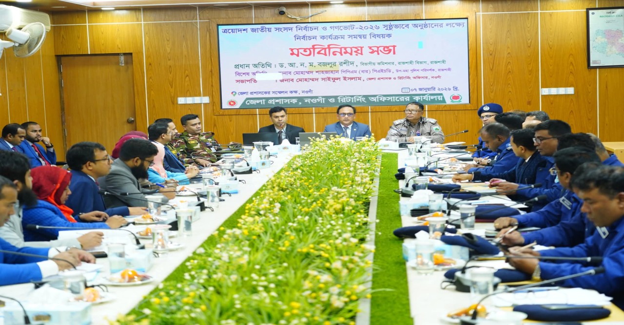 এ মতবিনিময় অনুষ্ঠানে পুলিশ সুপার মোহাম্মদ তারিকুল ইসলাম নওগাঁ, সেনাবাহিনীর প্রতিনিধি, নওগাঁর সকল উপজেলা নির্বাহী কর্মকর্তা, নওগাঁর সকল থানার অফিসার ইনচার্জবৃন্দ, নির্বাচন সংশ্লিষ্ট বিভিন্ন দপ্তরের কর্মকর্তা, আইন-শৃঙ্খলা বাহিনীর প্রতিনিধিগণ এবং সংশ্লিষ্ট অংশীজনরা উপস্থিত ছিলেন। সভায় নির্বাচন কার্যক্রমে বিদ্যমান চ্যালেঞ্জ, সম্ভাব্য ঝুঁকি এবং করণীয় বিষয়ে বিস্তারিত আলোচনা করা হয়। সভা শেষে জাতীয় সংসদ নির্বাচন ও গণভোট–২০২৬ সুষ্ঠুভাবে সম্পন্ন করার লক্ষ্যে সকল পক্ষের মধ্যে পারস্পরিক সহযোগিতা, সমন্বয় ও দায়িত্বশীল ভূমিকা পালনের দৃঢ় প্রত্যয় ব্যক্ত করেন।