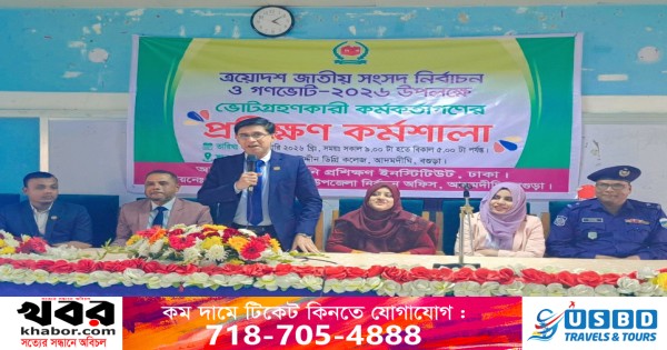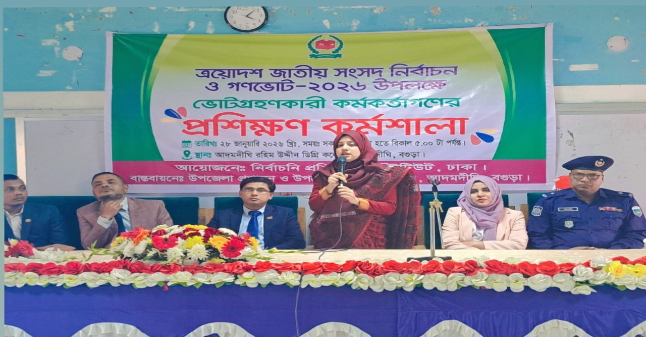 বুধবার,২৮ জানুয়ারি বিকেল ৪ টায় বগুড়ার, আদমদীঘি উপজেলার রহিম উদ্দিন ডিগ্রী কলেজে, গণভোেট ও ত্রয়োদশ জাতীয় সংসদ নির্বাচন-২০২৬ উপলক্ষে প্রিজাইডিং অফিসার, সহকারী প্রিজাইডিং অফিসার ও পোলিং অফিসারদের দিনব্যাপী প্রশিক্ষণ কর্মশালা অনুষ্ঠিত হয়েছে। এ অনুষ্ঠানে প্রধান অতিথি হিসেবে উপস্থিত ছিলেন বগুড়া জেলা প্রশাসক ও জেলা ম্যাজিস্ট্রেট মোঃ তৌফিকুর রহমান।