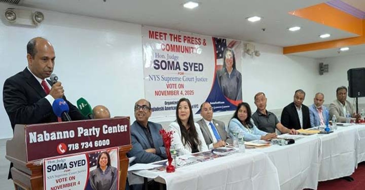 নিউইয়র্ক (ইউএনএ): নিউইয়র্ক সিটি তথা যুক্তরাষ্ট্রের ইতিহাসে প্রথম বাংলাদেশী আমেরিকান ও মুসলিম সোমা সাঈদ কুইন্স কাউন্টির সিভিল কোর্টের জাজ নির্বাচিত হওয়ার পর এবার সিটির সুপ্রীম কোর্ট জাস্টিস পদে প্রতিদ্ব›িদ্বতা করছেন। আগামী ৪ নভেম্বর সিটির মেয়র নির্বাচনের পাশাপাশি জাস্টিস পদেও নির্বাচন অনুষ্ঠিত হবে। এ উপলক্ষ্যে গত ১৮ আগষ্ট সোমবার সন্ধ্যায় জ্যাকসন হাইটসের নবান্ন পার্টি সেন্টারে জাজ সোমা সাঈদের পক্ষ থেকে মিট দ্যা প্রেস এন্ড কমিউনিটি অনুষ্ঠানের আয়োজন করা হয়। খবর ইউএনএ’র।