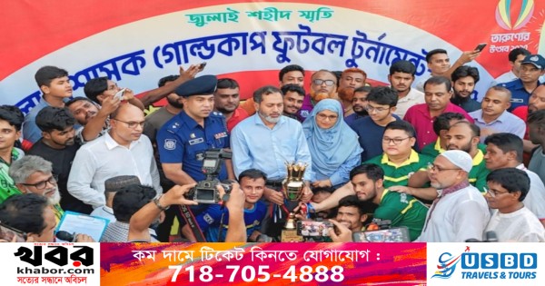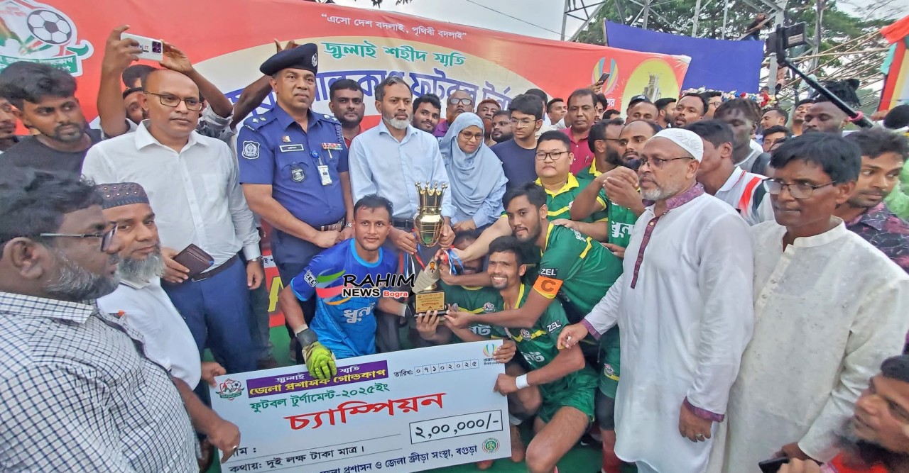 বগুড়ায় জুলাই শহীদ স্মৃতি জেলা প্রশাসক গোল্ডকাপ ফুটবল টুর্ণামেন্টে চ্যাম্পিয়ন হয়েছে ধুনট উপজেলা। ( ৭ অক্টোবর মঙ্গলবার ) ফাইনালে বগুড়া সদর উপজেলাকে টাইব্রেকারে ৫-৪ গোলে হারিয়ে শিরোপা জেতে ধুনট। শহীদ চান্দু স্টেডিয়াম সংলগ্ন ফুটবল মাঠে জেলা প্রশাসন ও জেলা ক্রীড়া সংস্থা আয়োজিত ফুটবল টুর্ণামেন্টের ফাইনাল ম্যাচের নির্ধারিত সময়ে কোন দল গোল করতে পারেনি। অবশেষে টাইব্রেকারে খেলার ফলাফল নির্ধারিত হয়। উক্ত খেলা শেষে চ্যাম্পিয়ন এবং রানার্স আপ দলের হাতে ট্রফি এবং প্রাইজমানি তুলে দেন রাজশাহী বিভাগীয় কমিশনার খোন্দকার আজিম আহমেদ ( অতিরিক্ত সচিব )এনডিসি।