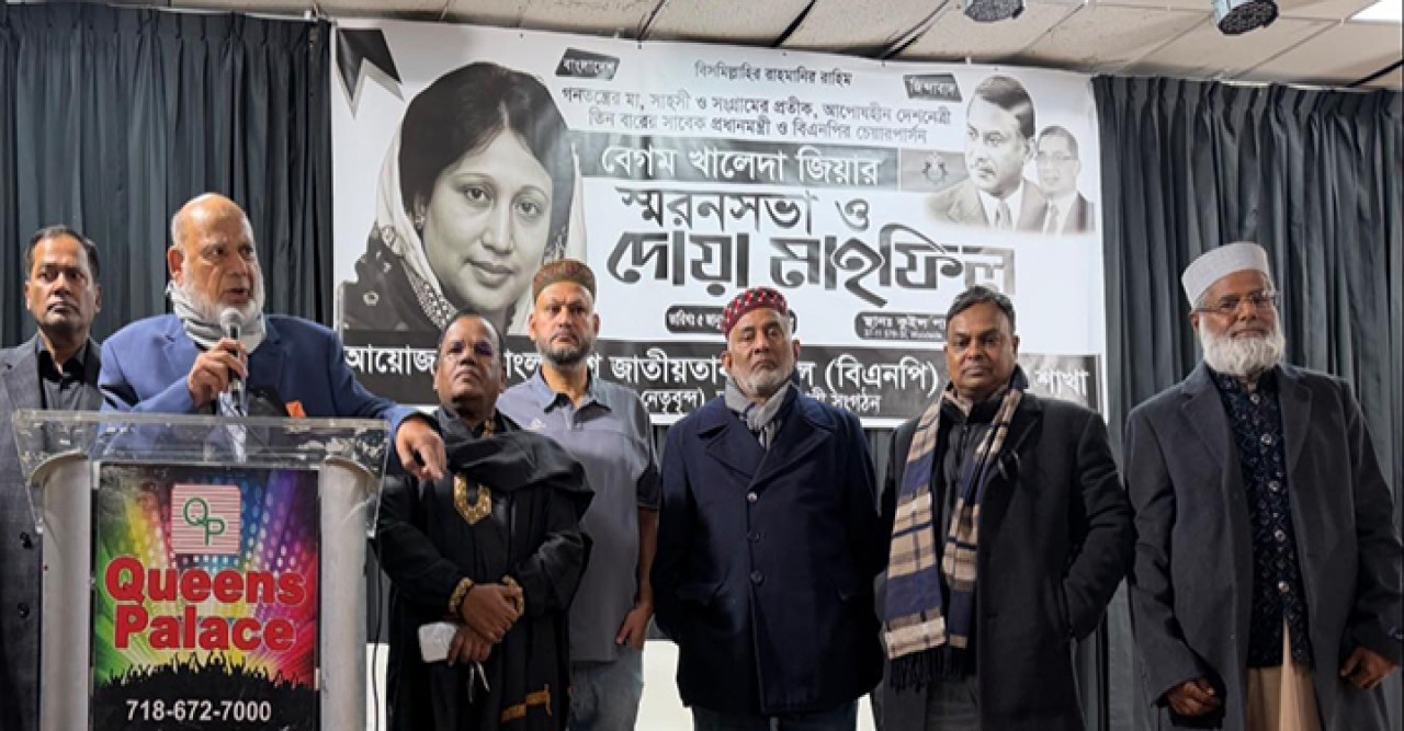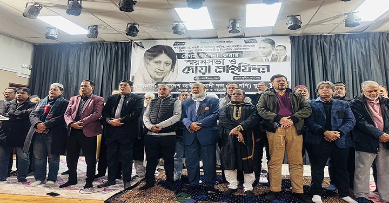 ৯১-এর নির্বাচনে বিজয়ী হয়ে বাংলাদেশে প্রথম নারী প্রধানমন্ত্রী নির্বাচিত হওয়ার বেগম জিয়া নিউইয়র্ক সফরকালে তার কাছে নিউইয়র্কে সোনালী এক্সচেঞ্জ প্রতিষ্ঠার জন্য অনুরোধ করেছিলাম। ম্যাডাম সে অনুরোধে সাড়া দিয়ে তৎকালীন অর্থমন্ত্রী এম. সাইফুর রহমানকে নির্দেশ দিয়েছিলেন এবং ১৯৯৪ সালে আমাদের সেই দাবী পূরণ হয়। শুধু তাই নয়, প্রবাসীদের প্রত্যাশা ‘ঢাকা-নিউইয়র্ক রুটে বিমানের ফ্লাইটও চালু হয়েছিল আমাদের পরম শ্রদ্ধেয় নেত্রী খালেদা জিয়ার প্রথম আমলেই। অর্থাৎ বেগম জিয়া শুধু আপসহীন নেত্রীই ছিলেন না, ছিলেন প্রবাসীবান্ধব নেত্রী। তার মৃত্যুতে দল, দেশ, জাতির অপূরণীয় ক্ষতি হলো। সভাপতির বক্তব্যে মোহাম্মদ গিয়াস উদ্দিন মরহুমা বেগম খালেদা জিয়ার প্রতি গভীর শ্রদ্ধা জানিয়ে বলেন, আমাদের প্রিয় নেত্রী মৃতুর পর যে সম্মান পেয়েছেন তার ইতিহাস হয়ে থাকবে। তাঁর ত্যাগ দেশ-জাতি মূল্যায়ন করেছে। তিনি তাঁর নেতৃত্ব আর যোগ্যতা দিয়ে আপোষহীন জাতীয় নেতায় টপরিণত হন। বেগম জিয়ার অসমাপ্ত কাজ দলের ভারপ্রাপ্ত চেয়ারম্যান এগিয়ে নিয়ে যাবেন বলে গিয়াস উদ্দিন আশাবাদ ব্যক্ত করেন।