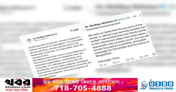 কোথাও কোথাও ভোটারদের বলা হচ্ছে, জামায়াতের প্রতীক দাঁড়িপাল্লায় ভোট দিয়ে বেহেশতে যাওয়া যাবে। এ ছাড়া নারীদের নানা সুযোগ-সুবিধারও প্রলোভন দেখানো হয়। নারীদের নিয়ে ব্যাপক প্রচারণা ও দলটির প্রতিশ্রুতিতে কেউ কেউ প্রলুব্ধও হয়েছেন। কিন্তু শীর্ষ নেতাদের সাম্প্রতিক বক্তব্যে ক্ষুব্ধ বিভিন্ন নারী সংগঠন এবং সাধারণ নারী ভোটার।প্রশ্ন উঠেছে- নারীদের নিয়ে জামায়াত নেতাদের সাম্প্রতিক বক্তব্য ও অবস্থান কি তাদের নির্বাচনী কৌশল নাকি নারীদের নিয়ে দলটির অতীত অবস্থানের প্রকাশ? সর্বশেষ জামায়াত আমীরের এক্স হ্যান্ডেল থেকে প্রচারিত পোস্টে তীব্র প্রতিক্রিয়া হয়েছে নারী সমাজ ও রাজনৈতিক অঙ্গনে। ওই পোস্ট প্রকাশের কয়েক ঘণ্টা পর অবশ্য দলটি দাবি করে- আমীরের এক্স অ্যাকাউন্ট হ্যাক হয়েছে। দলের দায়িত্বপ্রাপ্ত কেউ ওই পোস্ট করেননি। শনিবার বিকালে করা পোস্টে বলা হয়েছিল, ‘নারীর প্রশ্নে জামায়াতের অবস্থান বিভ্রান্তিকর বা অনুশোচনামূলক নয়- এটা নীতিগত। আমরা মনে করি না- নারীদের নেতৃত্বে আসা উচিত। জামায়াতে এটা অসম্ভব। আল্লাহ এটা অনুমোদন করেন না’।
