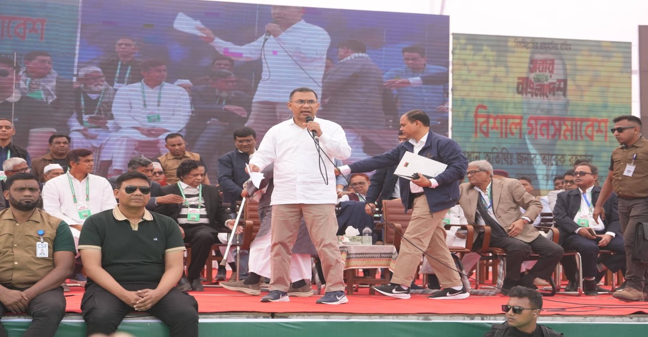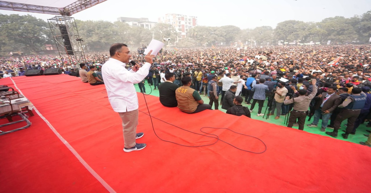 জনগণের সমর্থন নিয়ে, জনগণের ভালোবাসা নিয়ে, জনগণের শক্তিতে বাংলাদেশকে পুনর্গঠন করতে চাই। যে দেশে খেটে খাওয়া মানুষ নিরাপদে চলাচল, ব্যবসা-বাণিজ্য ও চাকরি-বাকরি করতে পারবে এবং যে বাংলাদেশের মা-বোনেরা নিরাপদে কাজ করতে পারবেন, মানুষজন ন্যূনতম চিকিৎসাসেবা পাবে।’ একাত্তরে যুদ্ধ করে দেশকে স্বাধীন করা হয়েছে উল্লেখ করে তারেক রহমান বলেন, ‘২০২৪ সালে আমরা ছাত্র-জনতার অভ্যুত্থানের মধ্য দিয়ে দেশের স্বাধীনতাকে রক্ষা করেছি। এখন দেশকে গঠন করতে হবে, দেশকে তৈরি করতে হবে, দেশের অর্থনীতি-গণতন্ত্রকে মজবুত করে গড়ে তুলতে হবে।’ তারেক রহমান বলেন, এ দেশে হাজার বছর ধরে প্রত্যেক ধর্মের মানুষ শান্তিতে বসবাস করে আসছে। আগামী হাজার বছরও প্রত্যেক ধর্মের মানুষ যেন শান্তিতে এ দেশে বসবাস করতে পারেন। যে যার যোগ্যতা ও মেধার ভিত্তিতে সামনে এগিয়ে যাবে। প্রত্যেককে বিচার করা হবে এর ভিত্তিতে। ধর্ম দিয়ে তাঁকে বিচার করা হবে না। বক্তব্য শেষে তারেক রহমান ঠাকুরগাঁও, পঞ্চগড় ও দিনাজপুর-১ আসনের ধানের শীষের ছয় প্রার্থীকে পরিচয় করিয়ে দেন। তিনি সবাইকে ধানের শীষ প্রতীকে ভোট দিয়ে এসব প্রার্থীকে জয়ী করার আহ্বান জানান। সবার উদ্দেশে তিনি বলেন, ‘আপনাদের কাজ হলো আগামী ১২ তারিখ পর্যন্ত এদের দেখে রাখবেন। ১২ তারিখ নির্বাচিত হলে তাঁদের দায়িত্ব হবে ২৪ ঘণ্টা আপনাদের দেখে রাখা।’