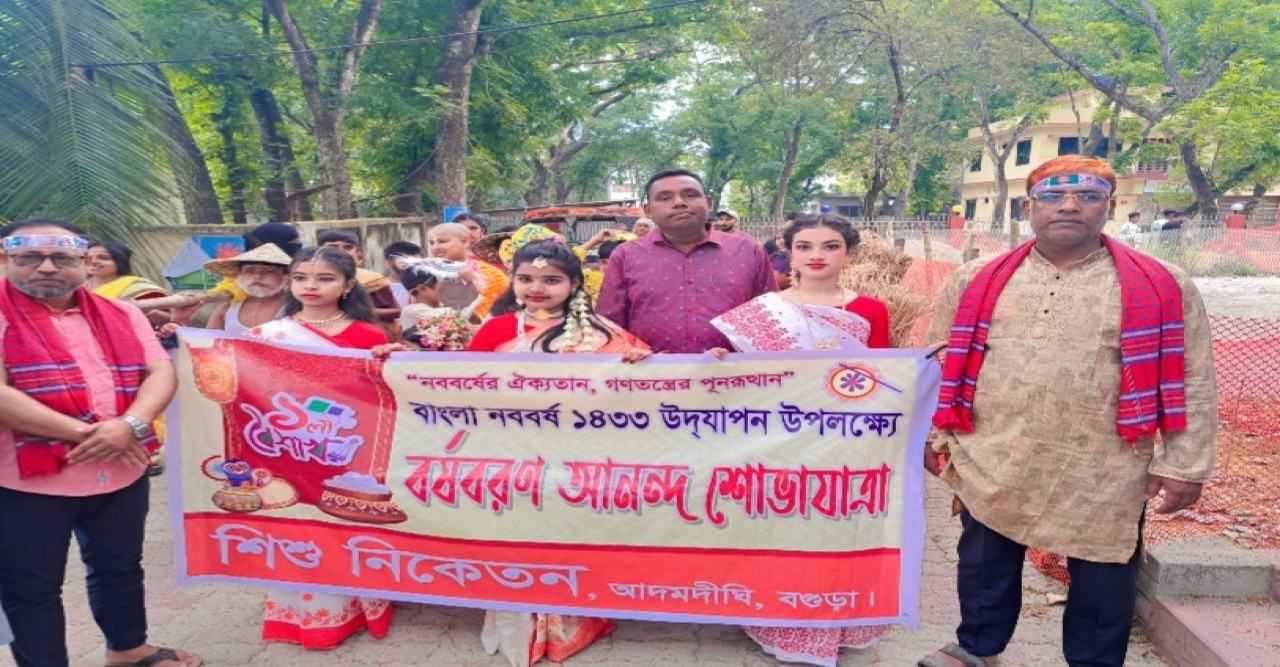 বগুড়ার আদমদীঘি উপজেলা প্রশাসনের উদ্যোগে নানা আয়োজনের মধ্য দিয়ে উৎসবমুখর পরিবেশে বাংলা নববর্ষ ১৪৩৩ উদযাপন করা হয়েছে। মঙ্গলবার (১৪ এপ্রিল ) সকাল ৯ টায় "জাতীয় সংগীত "ও" এসো হে বৈশাখ সংগীত" পরিবেশনের মাধ্যমে শুরু হয়, নববর্ষের শুভ সূচনা। এ উপলক্ষে আদমদীঘি উপজেলা পরিষদ প্রাঙ্গণ জুড়ে ছিল, আনন্দ-উৎসবের আমেজ। আদমদীঘি উপজেলা নির্বাহী অফিসার মাসুমা বেগমের সভাপতিত্বে পরিষদ চত্বর থেকে এক বর্ণাঢ্য বৈশাখী শোভা যাত্রা বের করা হয়।