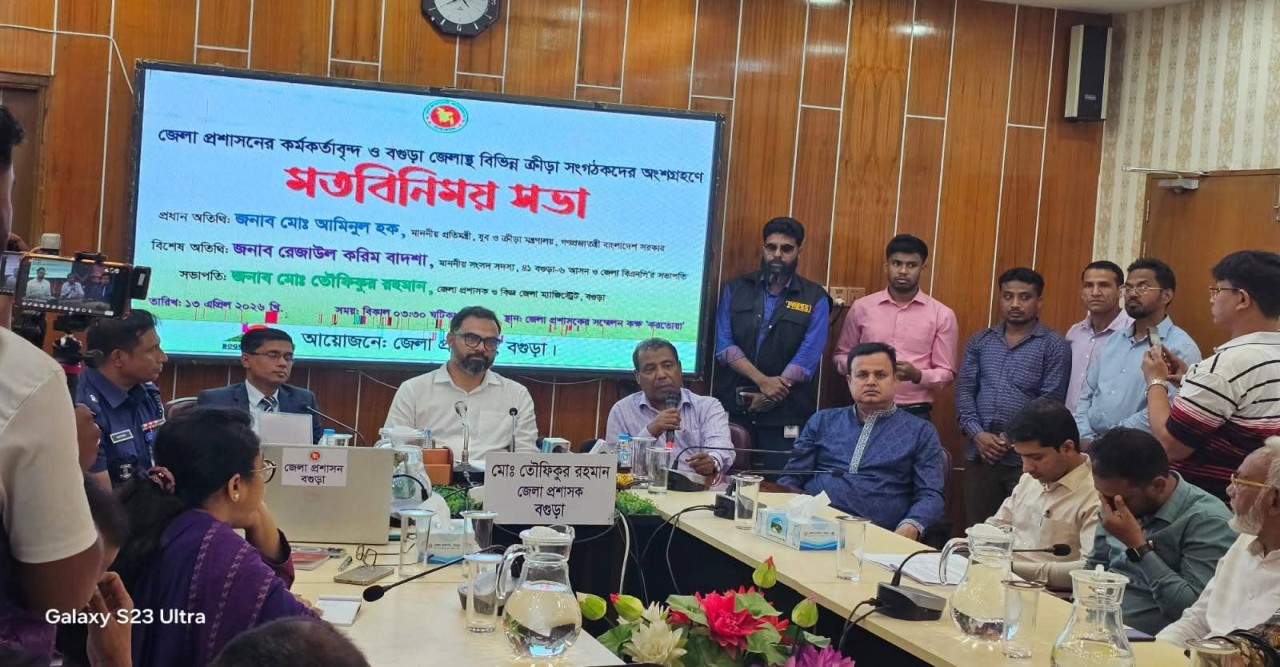 (১৩ এপ্রিল সোমবার) জেলা প্রশাসনের কর্মকর্তাবৃন্দ ও বগুড়া জেলার বিভিন্ন ক্রীড়া সংগঠনের নেতৃবৃন্দের অংশগ্রহণে মতবিনিময় সভায় সভাপতিত্ব করেন বগুড়া জেলা প্রশাসক মোঃ তৌফিকুর রহমান। প্রধান অতিথি হিসেবে উপস্থিত ছিলেন গণপ্রজাতন্ত্রী বাংলাদেশ সরকারের প্রতিমন্ত্রী মোঃ আমিনুল হক। বিশেষ অতিথি হিসেবে উপস্থিত ছিলেন বগুড়া জেলা বিএনপি’র সভাপতি ও নবনির্বাচিত সংসদ সদস্য মো, রেজাউল করিম বাদশা এবং বগুড়া জেলা বিএনপি’র ভারপ্রাপ্ত সাধারণ সম্পাদক ও সংসদ সদস্য মো, মোশারফ হোসেন। এছাড়াও সভায় বিভিন্ন অধিদপ্তরের প্রধানগণ, উপজেলার নির্বাহী কর্মকর্তাবৃন্দ, বিএনপির বিভিন্ন স্তরের নেতৃবৃন্দ, ক্রীড়া সংগঠনের প্রতিনিধি, সাংবাদিক এবং সমাজের বিশিষ্ট ব্যক্তিবর্গ উপস্থিত ছিলেন।